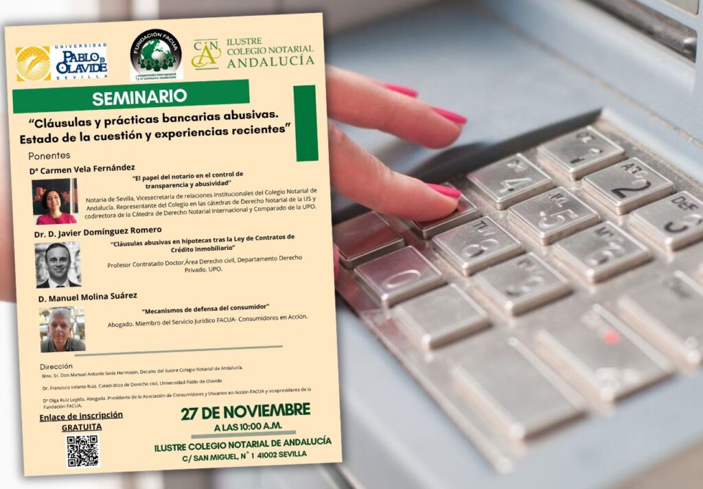 La Fundación FACUA y la Universidad Pablo de Olavide (UPO) de Sevilla celebrarán el próximo 27 de noviembre el seminario Cláusulas y prácticas bancarias abusivas. Estado de la cuestión y experiencias recientes. La actividad, enmarcada dentro de la Cátedra de Derecho de Consumo que organizan ambas organizaciones, cuenta con la colaboración del Ilustre Colegio Notarial de Andalucía y de FACUA-Consumidores en Acción.
